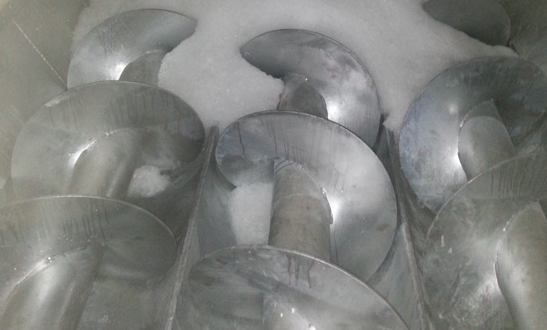 用途是預(yù)拌混凝土降溫(預(yù)拌混凝土是指由水泥、集料、水以及根據(jù)需要摻入的外加劑、礦物摻合料等組分按一定比例,在攪拌站經(jīng)計(jì)量、拌制后出售的并采用運(yùn)輸車(chē),在規(guī)定時(shí)間內(nèi)運(yùn)至使用地點(diǎn)的混凝土拌合物)。片冰通過(guò)輸冰螺桿送入到自動(dòng)稱(chēng)重的裝置,與片冰一起加入的還有冷凍水,兩者一起輸送到攪拌器。