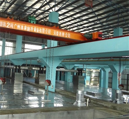 制冰池注滿鹽水,鹽水溫度被蒸發(fā)器冷卻。冰模內(nèi)加適量的水后放入制冰池內(nèi),利用低溫鹽水使桶內(nèi)水凍結(jié)成冰。出冰時(shí),m個(gè)冰模固定成一排,共排列n排,使用鋼架固定,為了加快冰的凍結(jié)速度,用攪拌器使鹽水均勻的在冰模間循環(huán),待冰桶內(nèi)水凍結(jié)成冰后,用行車裝置將冰桶架吊送到融冰池,在池中浸2-3分鐘,使冰桶內(nèi)冰的表面融化,再把冰桶放在倒冰架上,冰塊就很容易脫離冰桶傾倒在帶有坡度的滑冰道上,使冰塊滑到送冰車中。然后把冰桶注水后放入鹽水池中繼續(xù)循環(huán)制冰。