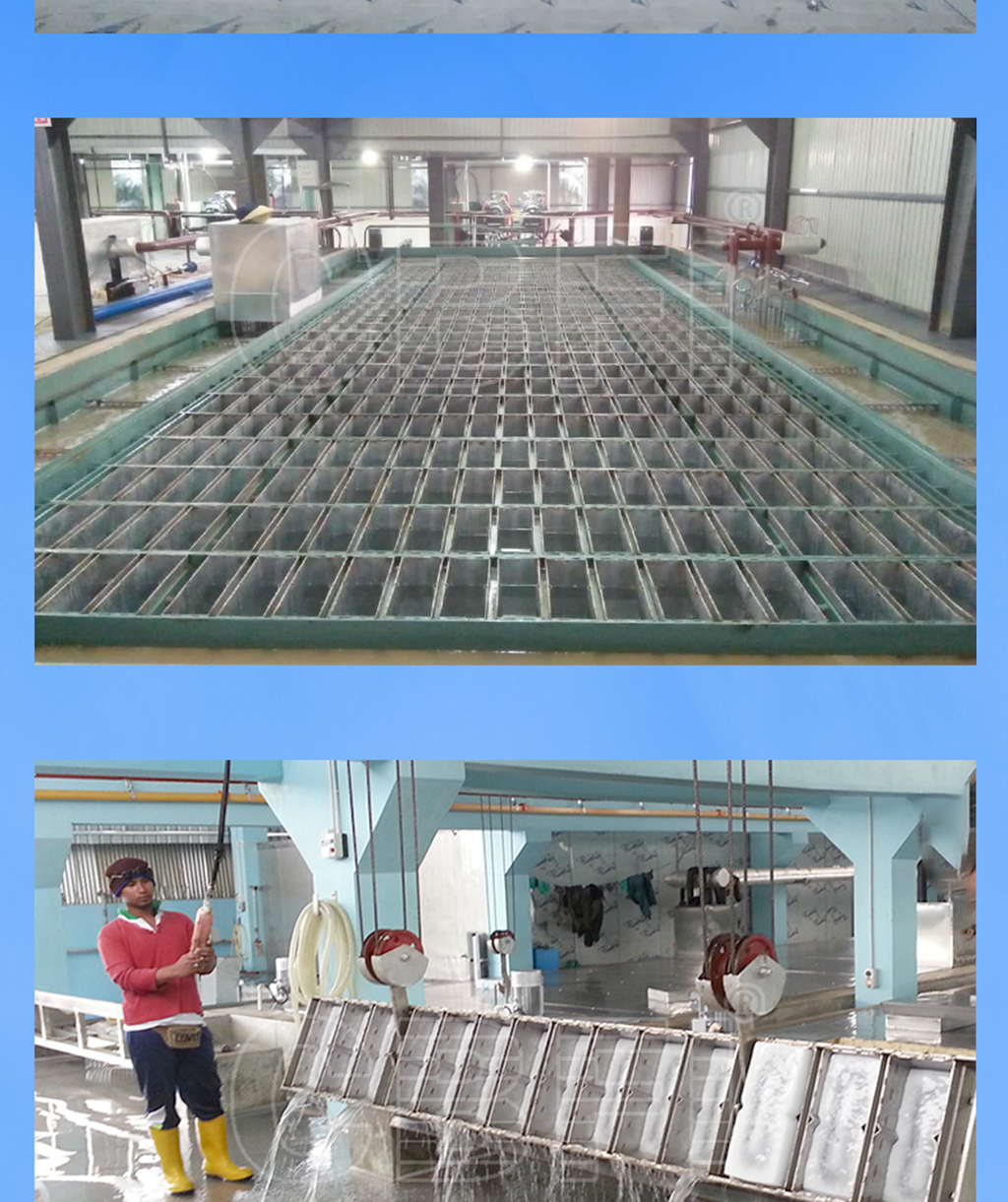 大型土建鹽水冰磚機(jī)即大噸位冰磚機(jī),采用磚石混凝土建筑鹽水池,通常配套大型行車系統(tǒng)。該種類型的鹽水冰磚機(jī)多見于區(qū)域性大型冰磚制造廠。例如馬來西亞--100噸大型冰磚制冰廠項(xiàng)目 和 馬來西亞--60噸大型冰磚制冰廠項(xiàng)目 。