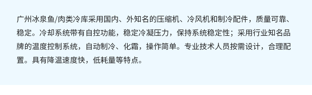 3、制冷設(shè)備節(jié)能省電,低噪音:肉類冷庫選用進(jìn)口或國產(chǎn)制冷壓縮機(jī),能耗低,噪音小。