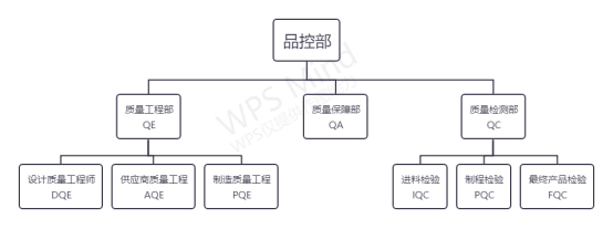 質(zhì)量控制部(QC)設(shè)有IQC(進(jìn)料檢驗(yàn))、PQC(制造檢驗(yàn))、FQC(成品檢驗(yàn))。