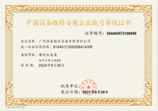 3. 冰泉制冷順利取得中國設備維修安裝企業(yè)能力等級證書