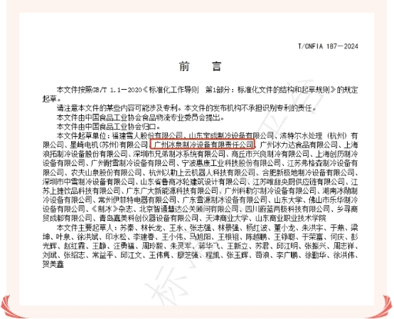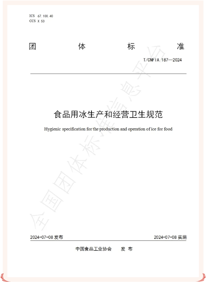 近日,由中國食品工業(yè)協(xié)會發(fā)布了《食品用冰生產(chǎn)和經(jīng)營衛(wèi)生規(guī)范》(T/CNFIA187-2024,冰泉制冷有幸作為標準起草單位之一,參與該項標準的起草編制。